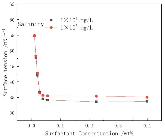 The surface tension of CHSB solutions with different concentrations was measured under salinity conditions of 1 × 104 mg/L and 1 × 105 mg/L (Figure 10). The hydrophilic groups of CHSB include an anionic sulfonate group and a cationic quaternary ammonium group. In salt solutions, there is electrostatic attraction between the oppositely charged ions of the surfactant molecules and electrostatic repulsion between ions of the same charge. The salt ions’ electrostatic shielding effect on the surfactant is weakened by the electrostatic attraction between counter-ions [,,]. When the concentration of CHSB exceeds the CMC (Critical Micelle Concentration), the salt ions in the high-salinity water help improve the adsorption of surfactant molecules at the gas–liquid interface, slightly reducing the surface tension. At a salinity of 1 × 105 mg/L, the amount of surfactant molecules adsorbed at the gas–liquid interface does not significantly decrease, and the surface tension only slightly increases [,,]. It is important to note that the addition of salt ions to the solution lowers the CMC value of CHSB, which also implies that the same concentration of CHSB solution may have a higher CMC multiple. This could have a certain impact on the stability of the foam liquid film.