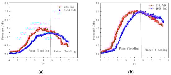 As the number of injected pore volumes (PVs) increases, stable foam flow is established in both cores, and the pressure characteristics in the middle sections of the cores gradually become consistent. Although the intensity of the Jamin effect, caused by the generation and collapse of foam, differs between the high-permeability and low-permeability cores, the pressure distribution patterns in the high-permeability and low-permeability cores become similar during the stable foam flow stage [,].