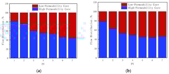 Flow distribution in parallel cores: (a) CHSB foam, (b) polymer-enhanced CHSB foam.