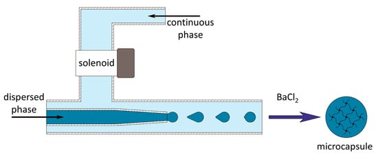 To create and test the microcapsules, a microfluidic setup was developed. It operates based on well-known principles of microfluidics []. To create the alginate microcapsules, the external influence of the dispersed phase on the flow of the continuous phase is used [] (Figure 2). The operating conditions of the microfluidic setup were chosen so that microcapsules with an average size of 496 ± 46 µm were formed.