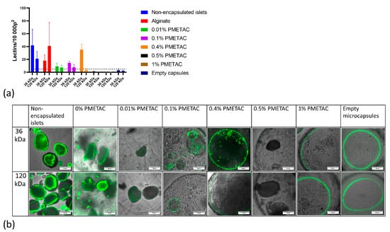 We have determined that the concentration of the alginate polymer coating affects the permeability of the microcapsule (Figure 4). With increasing polymer concentration, the permeability of the microcapsules decreases. Alginate microcapsules coated with 1% and 0.5% PMETAC are impermeable to low-molecular weight lectins, so the diffusion of nutrients can be difficult, making such microcapsules unsuitable for islet encapsulation. By contrast, alginate microcapsules that are not coated or coated with 0.01% or 0.1% PMETAC are permeable to 120 kDa lectins, so such microcapsules will not isolate the islet from the immune system and are therefore not suitable for transplantation. Alginate microcapsules coated with 0.4% PMETAC are permeable to low-molecular weight lectins and impermeable to high-molecular weight lectins. Thus, in our tests, we have demonstrated that microcapsules with 0.4% PMETAC present optimum results in terms of permeability—they are selectively permeable and suitable for islet encapsulation for the purpose of immunoisolation.