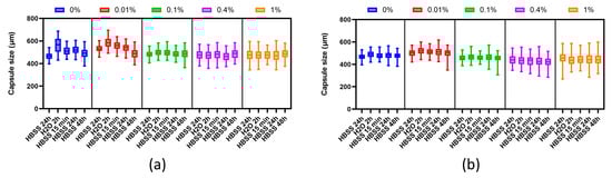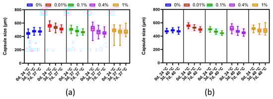 Graph of сhanges in the size of microcapsules coated with different concentrations of PMETAC in the test for thermal stability: (a) 37 °C and (b) 40 °C.