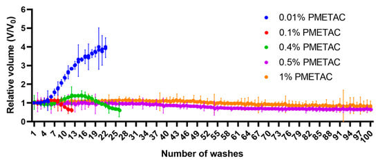 Graph of сhanges in the volume of microcapsules, coated using different concentrations of PMETAC, during the multi-wash microcapsule stability test.