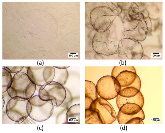 To increase the stability of the alginate microcapsules, they were coated with the cationic polymer PMETAC using solutions of the following concentrations: 0%; 0.01%; 0.1%; 0.5%; 0.4%; and 1%. Visually, an increase in PMETAC concentration correlated with increased thickness and induration of the microcapsule shell (Figure 3). Subsequently, the microcapsules were covered with an additional layer of alginate to increase their biocompatibility.
