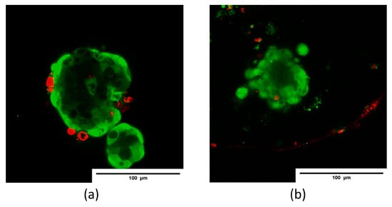 Confocal fluorescence images showing islets (a) without and (b) with encapsulation, labeled with viability stains Calcein AM (green) and propidium iodide (red). (Scale bar 100 μm).
