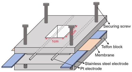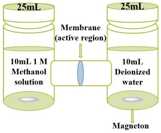 Methanol permeability was obtained via a self-conceived H-type diaphragm diffusion device as show in Figure 2. The device has two chambers, one diffusion chamber filled with 10.0 mL 1 M methanol solution and the other sampling chamber filled with the same volume of deionized water. A proton exchange membrane was placed in the middle of the diffusion device. The chambers were separated by the membrane sample and stirred with a magnetic stirrer for diffusion at room temperature, which ensured the uniformity of the chamber during the test. The time interval of sampling was 1 h, and the whole sampling was completed within 6 h. The methanol concentration in the sampling chamber was measured via a gas chromatograph (9790II, Zhejiang Fuli Analytical Instruments Co., Ltd., Wenling, China). Methanol permeability (p, cm2/s) was calculated according to the following equation [].