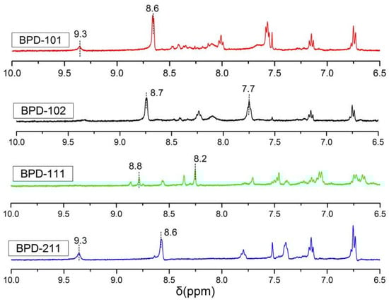 Successful polymerization of the BPD-x polymers with –COOH groups end-capped were verified with the 1H NMR spectra data in Figure 3. The monomer ratios of 1:0:1 and 2:1:1 were end-capped with –COOH groups due to the excess BTA in synthesis. The other two synthesis ratios of 1:0:2 and 1:1:1 were end-capped with the –NH2 group because of the small proportion of BTA. Therefore, the strong signals at 9.35 ppm presented the phenyl rings between two –COOH groups of BPD-101 and BPD-211. The peak around 8.6 ppm (BPD-101 and BPD-211), 8.7 ppm (BPD-102) and 8.8 ppm (BPD-111) can be assigned to protons of the phenyl rings between the –COOH group and the –CONH group. The chemical shift at 7.7 ppm of BPD-102 and 8.2 ppm of BPD-111 were ascribed to the phenyl rings between two –CONH groups.