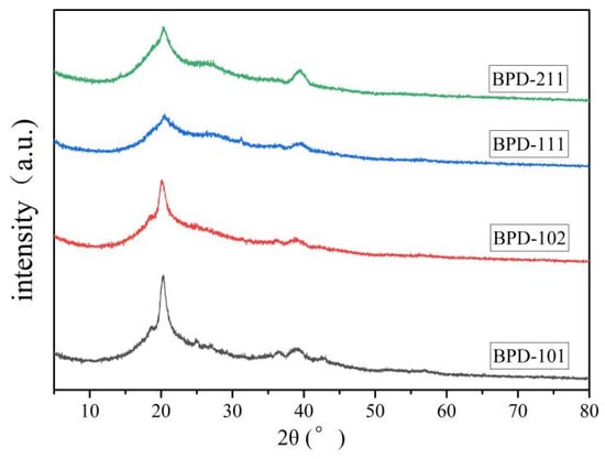 In addition, the chemical structures of the polyamide polymers and membrane were investigated with the FT-IR spectra, as shown in Figure 4a,b. The characteristic peak of the polyamide polymers at 1729 cm−1 is ascribed to the vibration of C=O and the peaks at 1490 and 1366 cm−1 (1506, 1404 in Figure 4b) belong to the vibration of N–H and C–N. The peaks at 3410 (Figure 4a) and 3444 cm−1 (Figure 4b) belong to the stretching vibration of O-H and the peaks at 1190 cm−1, 1020 cm−1 and 720 cm−1 (Figure 4a) are assigned to sulfonated groups of polymers. As a result, the four polymers are successfully synthesized. Figure 5 depicts the XRD patterns of BPD-x membranes. A typical peak (~20°) composed of crystalline regions of polyamide [] clearly appears in all these patterns. Table 1 shows the molecular weight (Mw) and the polydisperisty index (PDI) of the polymers. All these results verify that BPD-x polymers are prepared successfully.