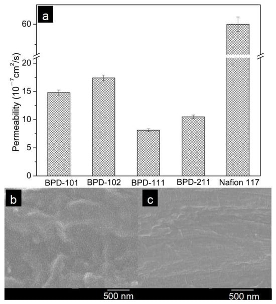 The BPD-x blend membranes can be used in the direct methanol fuel cell application. In this case, the low methanol permeability of the membranes is the key factor to prevent the fuel of methanol crossover from the anode to cathode. Figure 6a compares the methanol permeability through the BPD-x membrane and Nafion 117 membrane and gradually decreases as the monomer PPD content increases. The methanol permeability value of the BPD-x membranes was found to be in the range of 8.13 × 10−7 cm2/s to 17.40 × 10−7 cm2/s, much lower than the value through the Nafion 117 membrane. In particular, the methanol permeability value of the BPD-111 membrane is as low as 8.13 × 10−7 cm2/s, one order of magnitude smaller than that of the Nafion 117 membrane. The BPD-111 membrane containing the lowest methanol permeability of the BPD-x membranes was ascribed to the successful introduction of the non-sulfonated hydrophobic monomer PPD in synthesis and effective adjusting the hydrophobic groups of the sulfonic acid groups (–SO3H) and carboxylate groups (–COOH) in the BPD-x polymer. The flat and uniform topography SEM image of the cross-section surface of BPD-101 and BPD-211 membranes also illustrated the low methanol permeability, as shown in Figure 6b,c. The SEM images display a much smoother cross-section surface for the BPD-211 membrane than the BPD-101 membrane. In addition, the high degree of uniformity forms the basis for the stronger mechanical strength of the BPD-211 membrane compared with the BPD-101 membrane. The low methanol permeability of the BPD-x membrane indicates that the BPD-x proton exchange membrane is suitable for the application in DMFCs.