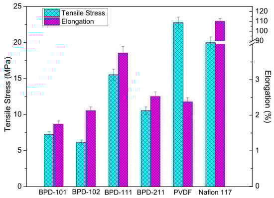 The mechanical stability of the BPD-x proton-exchange membranes was subsequently measured for the consideration of long-term application in DMFC []. The tensile stress and elongation at break of the membranes are shown in Figure 9. According to the tensile stress and elongation at break bar graph (Figure 9), it is found that the tensile stress of the membranes increases with the ratio of the PPD monomer in synthesis. The tensile stress of the BPD-101 membrane is 7.26 MPa, the BPD-102 membrane is 6.18 MPa, the BPD-111 membrane is 15.54 MPa, and the BPD-211 membrane is 10.55 MPa. From the tensile stress graph (Figure 9), it was found that the non-sulfonated hydrophobic monomer p-phenylenediamine (PPD) was successfully introduced by adding different ratios of PDD in synthesis to adjust the sulfonic acid groups (–SO3H) and carboxylate group (–COOH) of the polymer. Therefore, the tensile stress was effectively improved by regulating the hydrophobic groups of the BPD-x polymer. The tensile stress of membranes is 7–15 MPa, which was lower than that of the Nafion 117 membrane (20 MPa). The BPD-111 membrane exhibits the best tensile stress of 15.54 MPa, which is a little lower than that of the Nafion 117 membrane and might be adequate for fuel cell-operation applications [].