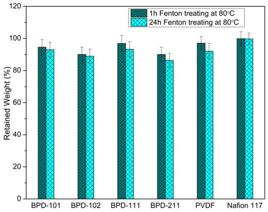 As an important factor to evaluate the practicability of the PEM in fuel cells, the oxidative stability of the BPD-x blend membranes was studied. As shown in Figure 10, the retained weights of the BPD-x membranes treated in Fenton’s reagent (80 °C) for 1 h and 24 h were measured to be 90–97% and 89–93%, respectively. The BPD-111 membrane exhibited the highest oxidative stability among the four membranes. The measured residual weights of the BPD-111 membrane were 97% and 93% after treating in Fenton’s reagent (80 °C) for 1 h and 24 h, respectively. The measured value of the BPD-111 membrane is comparable to the value of the Nafion 117 membrane []. At the same time, this result indicated that the proton-exchange membrane is synthesized by introducing a non-sulfonated hydrophobic PPD monomer, which effectively enhances the oxidative stability of blend membrane.