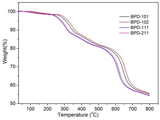The thermal stability of the BPD-x blend membranes was subsequently analyzed to assess the long-term application in DMFCs. The typical thermal stability of the BPD-x membranes was examined under a nitrogen atmosphere. The thermogravimetric analysis (TGA) curves of the BPD-x membrane are plotted in Figure 11. These BPD-x membranes show three-step weight-loss thermograms in the curve analysis. The first slight weight loss at about 200 °C is attributed to the evaporation of absorbed water and solvent. The second weight loss at about 500 °C is caused by the degradation of the sulfonic groups from the membrane. The degradation at about 650 °C is due to the decomposition of the main chains, include the breaking of the amide bond (–CO–NH–). And the 5% mass loss temperature of the membrane is higher than 200 °C. In conclusion, the BPD-x membranes exhibit satisfied thermal stability for the direct methanol fuel cell applications.