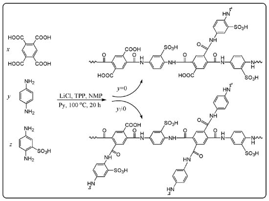 Polyvinylidene fluoride (PVDF, 98%), 1,2,4,5-benzenetetracarboxylic acid (BTA, 98%), 2,5-diaminobenzenesulfonic acid (DSA, 98%), p-phenylenediamine (PPD, 98%), triphenylphosphite (TPP, 99%) and N-methyl-2-pyrrolidone (NMP, 98%) were provided by Sigma-Aldrich Reagent, Ltd. (St. Louis, MO, USA). BTA, PVDF, DSA and PPD were dried under vacuum at 80 °C for 8 h. Dimethyl sulfoxide (DMSO, 98%), pyridine (Py, 98%), LiCl and NaOH were purchased from Sinopharm Chemical Reagent Co., Ltd. (Chengdu, China), and used as received without further purification. The Nafion 117 was purchased from Dupont Co. (Wilmington, DE, USA), and the Nafion 117 membrane was treated sequentially with 5% H2O2 solution, 1 M H2SO4 solution and deionized water at 100 °C for 1 h. TPP and NMP were used as received without any purification.