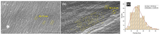 To understand the effect of tin weighting on the structure of the silk and the nature of the distribution of the metal salts on the fibres, SEM micrographs and EDS elemental mapping were conducted. Figure 1 presents scanning electron (SEM) micrographs captured at a magnification of 50,000 times, revealing the nanoscale morphology of silk fibres. The left image (a) displays an unmodified, NW silk fibre, showcasing its surface topography and fibrillar structure as highlighted in yellow on the fibre’s surface. Typically, an unmodified silk fibre would also exhibit other features such as residuals of sericin or some contaminants with irregular sizes. In contrast, the middle image (b) depicts a silk fibre after undergoing four successive baths of the tin-phosphate-weighting technique (4P). The image of the weighted sample exhibits bright spots, and yellow circles highlight these nanofeatures showing part of their distribution on the fibre’s surface. These bright spots are likely attributable to tin-phosphate nanoparticles deposited on the fibre surface and their effect on the swelling of the bead-like structure of fibrils during the weighting process. The scale bar in the images highlights the nanometre-scale dimensions of the fibre structure [35,36,37] in addition to the round nanofeatures, the size of which is ca. 20 nm with a standard deviation of 0.229 nm (Figure 1c). Additional examples of the samples can be found in the Supplementary Materials.