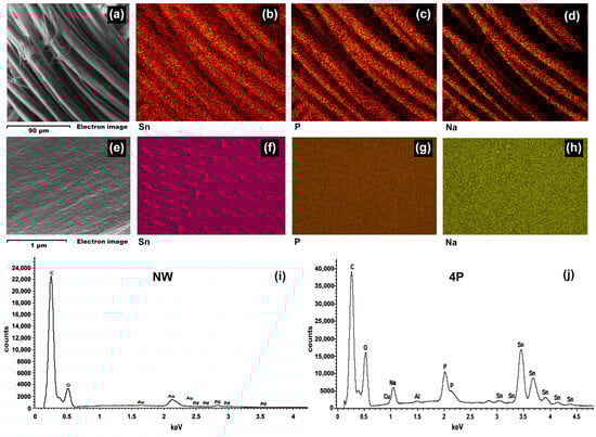 To elucidate the nature of the observed nanostructures, energy-dispersive X-ray spectroscopy (EDS) analysis was performed on NW and 4P samples, as shown in Figure 2. The EDS spectra (Figure 2i,j) for the 4P sample revealed the presence of Sn, P, and Na compared to the NW sample, indicative of the tin-phosphate-weighting process. Elemental mapping images (Figure 2b–d,f–h) confirmed a uniform distribution of these elements across both the silk fibre bundle and individual fibres, suggesting the formation of tin-phosphate nanoparticles on the fibre surface [12].