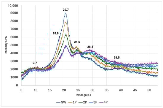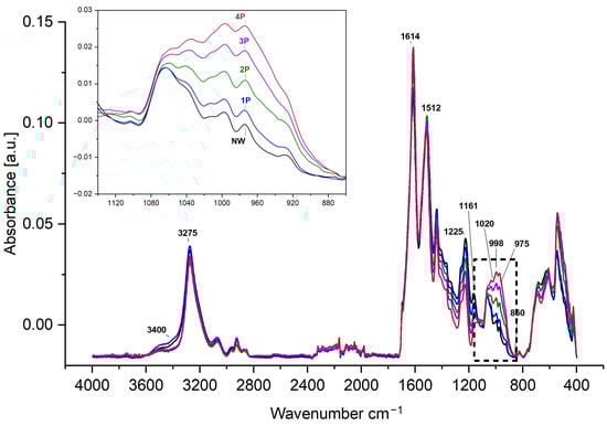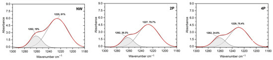 In this research, the β-sheet and α-helix and/or random coil contents were calculated from the deconvoluted peak of amide III at around 1262 cm−1 and 1225–1229 cm−1, respectively. It has been determined that there is a reduction in the random coil to an increase in the β-sheet of around 5.6% in the 4P sample compared to the NW sample, as Figure 4 shows.