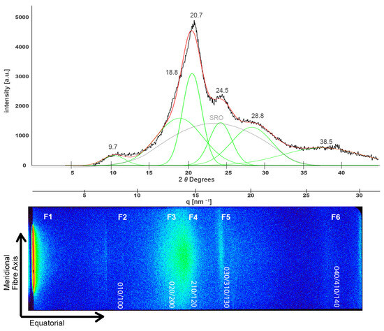 Deconvoluted XRD peaks for a pristine NW silk sample (top). The black line represents the original diffractogram, the red line is the fitting curve, the deconvoluted peaks are shown in green and (SRO) peak is highlighted in grey. This XRD spectrum is shown alongside the 2D SWAXS scattering image at the (bottom) where different scattering features are highlighted as F1 to F6.