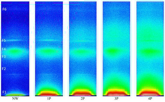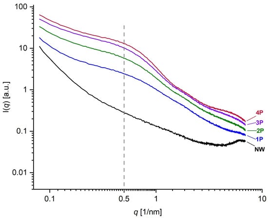The NW sample in Figure 7 can be taken as the reference sample and the SWAXS images of the increasingly tin-weighted silk samples follow successively to the right side of the figure. The latter reveals the trend of changes by tin weighting in the typical 2D scattering image. With the accumulated additions of weighting agents, enhanced intensities follow an ascending trend with the increase in metal concentration within the fibres due to tin oxide loading. With the accumulation of tin-weighting salts in the silk from 1P to 4P, one can observe a noticeable successive broadening of the central peak (F1; high-intensity red area that transits to a less intense yellow and green area) around the primary beam, which is positioned at the very bottom of the images. This is the influence of the increasing contents of the tin in silk, which increases the scattering contrast of the fibres and consequently also the scattering intensity. In parallel, this central peak area seems to be increasingly stretching towards larger q values. This effect can be monitored in more detail in the SAXS curves in Figure 8, which were measured by the 1D detector and also exhibit a noticeable peak broadening and a scattering intensity increase from the 1P to 4P samples in this regime. Interestingly the peak at around 0.5 nm−1 (corresponding to area F1 in Figure 7) seems to more or less keep the position with increasing tin concentration in the samples. According to Bragg’s law, this q value corresponds to the distance of about 12.5 nm, proving that tin weighting certainly influences and changes the structure of the silk fibres on the nanoscale size level.
