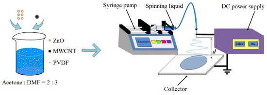 The applied spinning liquids included PVDF (MW = 1,000,000 g/mol, Shunjie Plastics, Shantou, China) solution, MWCNT dispersions in PVDF solution, and MWCNT/ZnO dispersions in PVDF solution. PVDF solution used a mixed solvent of acetone and N-N dimethylformamide (DMF) with a ratio of 2:3 v/v. MWCNTs (Power McLean, Shanghai, China) had an outside diameter of 40 nm, an inside diameter of 7 nm, and an average length of 15 nm. ZnO particles (Aladdin Reagent, Shanghai, China) had a diameter of 30 nm.