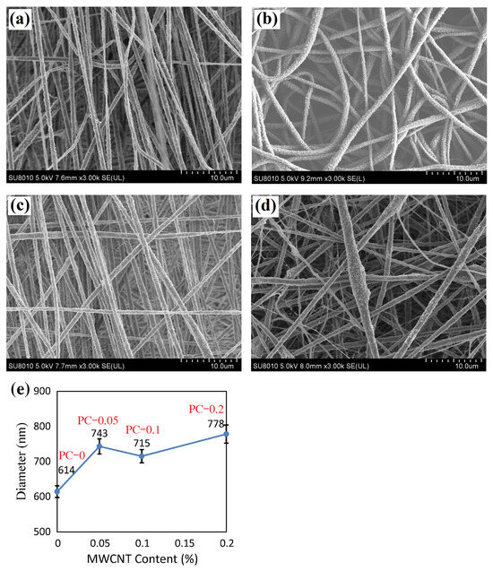 SEM images of PVDF nanofibrous film and PVDF/MWCNT composite fibrous films: (a) PC–0 film, (b) PC–0.05 film, (c) PC–0.1 film, (d) PC–0.2 film, and (e) average fiber diameter vs. MWCNT content.