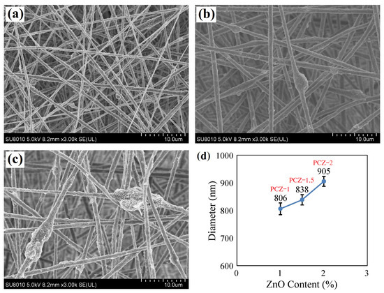 SEM images of PVDF/MWCNT/ZnO composite nanofibrous films: (a) PCZ–1 film, (b) PCZ–1.5 film, (c) PCZ–2 film, and (d) average fiber diameter vs. ZnO content.