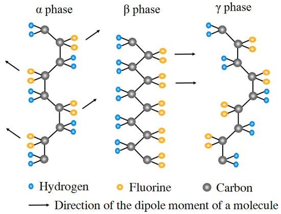 PVDF is a semi-crystalline polymer with the molecular formula –(CH2–CF2)n–. Among the five crystalline phases, at least four crystalline phases may transform into each other under some conditions, such as mechanical stretching and high-temperature polarization methods [33,34]. Figure 5 shows the α-, β-, and γ-phase crystalline conformations of PVDF. The α-phase crystals with the trans-gauche (TGTG) configuration have a non-polar crystal structure as molecular chains are aligned anti-parallel to each other and dipole moments counteract each other. The β-phase crystals represented by the all-trans (TTTT) configuration have strong polarity and good piezoelectricity since they have the highest dipole moment per unit cell with their dipoles pointing in the same direction. The γ-phase crystals are arranged in a polar manner by the TTTGTTTG configuration; weak polarity may be obtained by applying a high electric field.