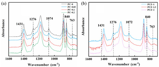 FTIR spectra of various nanofibrous films: (a) neat PVDF film (PC–0) and PVDF/MWCNT composite films (PC–0.05, PC–0.1, and PC–0.2), and (b) PVDF/MWCNT/ZnO composite films (PCZ–1, PCZ–1.5, and PCZ–2).