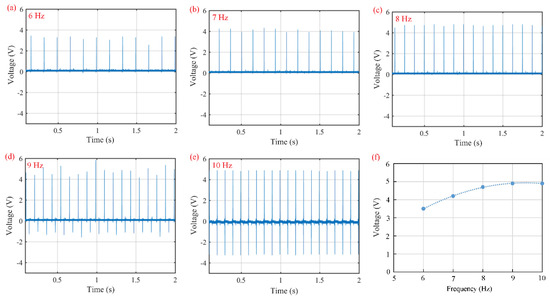 Open-circuit voltages of piezoelectric sensors with the PC–0.1 film as a functional film under applied impact loads at various excitation frequencies: (a) 6 Hz, (b) 7 Hz, (c) 8 Hz, (d) 9 Hz, (e) 10 Hz, and (f) open-circuit voltage vs. excitation frequency.