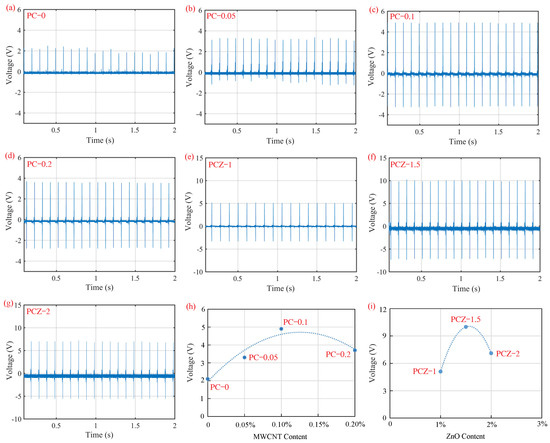 Open-circuit voltages of piezoelectric sensors with various nanofibrous films as functional layers under applied impact loads at 10 Hz: (a) PC–0 film, (b) PC–0.05 film, (c) PC–0.1 film, (d) PC–0.2 film, (e) PCZ–1 film, (f) PCZ–1.5 film, (g) PCZ–2 film, (h) open-circuit voltage vs. MWCNT content, and (i) open-circuit voltage vs. ZnO content.