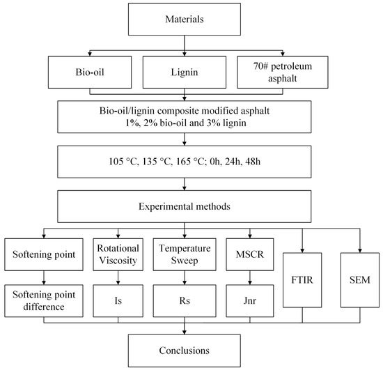Two groups of bio-oil/lignin composite-modified asphalt with different proportions were poured into aluminum tubes with a diameter of 2.5 cm and a height of 14 cm. The aluminum tubes containing the asphalt samples were stored at different temperatures (105 °C, 135 °C, 165 °C) for various durations (0, 24 h, 48 h). After storage, the aluminum tubes were removed and cooled and then cut into three equal portions. Samples were taken from the top and bottom parts of the aluminum tubes containing the bio-oil/lignin composite-modified asphalt to evaluate their storage stability based on physical properties, rheological characteristics, and functional group composition. If there is minimal difference in performance between the top and bottom portions of the bio-oil/lignin composite-modified asphalt, it indicates good stability of the samples. Conversely, if there is a significant difference, it suggests inadequate storage stability of the composite-modified asphalt. The experimental flowchart of this study is shown in Figure 1.