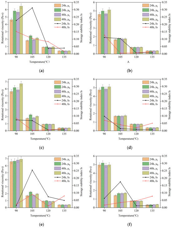 The rotational viscosity of composite-modified asphalt and the storage stability index (Is): (a) 105 °C, 1% bio-oil + 0.3% lignin; (b) 105 °C, 2% bio-oil + 0.3% lignin; (c) 135 °C, 1% bio-oil + 0.3% lignin; (d) 135 °C, 2% bio-oil + 0.3% lignin; (e) 165 °C, 1% bio-oil + 0.3% lignin; (f) 165 °C, 2% bio-oil + 0.3% lignin.