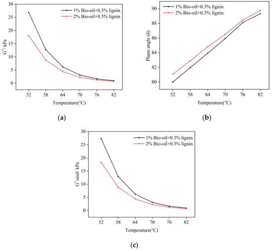 Temperature scan results of bio-oil/lignin composite-modified asphalt: (a) complex modulus (G*); (b) phase angle (δ); (c) rutting factor (G*/sinδ).