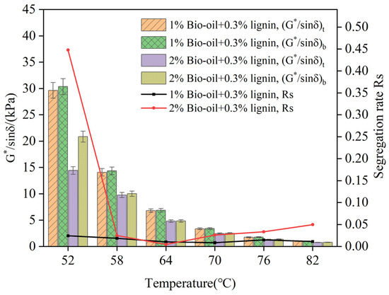 In order to study the effect of bio-oil content on the storage stability of modified asphalt, the temperature sweep test of the composite-modified asphalt in the top and bottom parts of the aluminum tube after storage at 105 °C for 48 h was carried out, and the rutting factor and Rs were calculated, as shown in Figure 7.