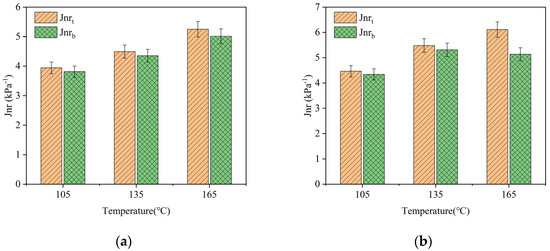 To investigate the effect of storage temperature on the Jnr of the composite-modified asphalt, Multiple Stress Creep Recovery (MSCR) tests were conducted on the asphalt samples with a 1% bio-oil content, which were stored at different temperatures for 24 h. The results of the Jnr are shown in Figure 10.