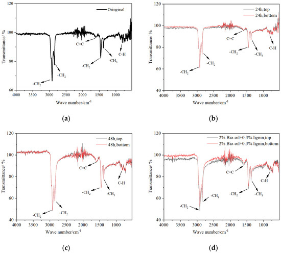 To investigate the influence of storage time, temperature, and bio-oil content on the storage stability of composite-modified asphalt, the infrared spectrum of the composite-modified asphalt was obtained by scanning it using a Fourier-transform infrared spectrometer. Figure 11 shows the infrared spectrum of bio-oil/lignin composite-modified bitumen from bio-oil.