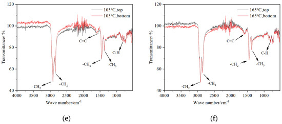 Infrared spectrogram of bio-oil/lignin composite-modified asphalt: (a) The 1% bio-oil content is not stored; (b) 1% bio-oil content, storage temperature 135 °C, storage for 24 h; (c) 1% bio-oil content, storage temperature at 135 °C, storage for 48 h; (d) 2% bio-oil content, storage temperature 135 °C, storage for 24 h; (e) 1% bio-oil content, storage temperature 105 °C, storage for 24 h; (f) 1% bio-oil content, storage temperature 165 °C, storage for 24 h.