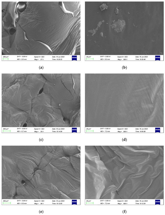 The experiment utilized a Zeiss Sigma 300 model scanning electron microscope (SEM) with an accelerating voltage ranging from 0.02 to 30 kV. The equipment is from the ZEISS Group (Oberkochen, Germany). The magnifications chosen were 34–37× and 500×. Firstly, the composite-modified asphalt with a bio-oil content of 1% was scanned. Subsequently, the asphalt samples from the top and bottom of the aluminum tubes were scanned after 24 h and 48 h of storage at a temperature of 165 °C. This was performed to observe the morphology of the composite-modified asphalt.