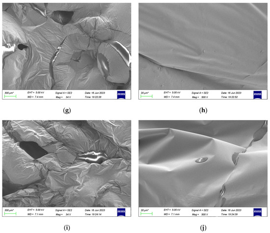 SEM image of bio-oil/lignin composite-modified asphalt: (a) original (37×); (b): 500×; (c) the top part of the aluminum tube specimen was stored for 24 h (35×); (d) 500×; (e) the bottom part of the aluminum tube specimen was stored for 24 h (36×); (f) 500×; (g) the top part of the aluminum tube specimen was stored for 48 h (34×); (h) 500×; (i) the bottom part of the aluminum tube specimen was stored for 24 h (34×); (j) 500×.