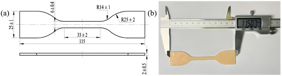 The PVA hydrogel materials used in this study were primarily formed through physical cross-linking, such as hydrogen bonding [12], and were obtained from the Lanzhou Institute of Chemical Physics, Chinese Academy of Sciences. First, the PVA sol was dried at room temperature to obtain a dry PVA gel. Subsequently, it was immersed in a salt solution to form a dense hydrogen bond network between the hydroxyl groups of the PVA molecular chains, which promoted the aggregation and crystallization of the PVA molecular chains, yielding a salt-induced PVA hydrogel with a high degree of crystallinity. The salt-induced PVA hydrogel was dialyzed with deionized water to obtain the final PVA hydrogel. By adjusting factors such as the PVA mass fraction, salting-out concentration, experimental temperature, and time, the properties of PVA hydrogels can be effectively regulated. The initial maximum tensile strength of the customized PVA hydrogel prepared and used in this study was approximately 5 MPa, with a maximum elongation of around 300%, a moisture content of about 62%, and a polymerization degree of 1750 ± 50. The PVA hydrogel samples were cut to obtain aging samples (dog bones, 115 mm × 25 mm × 2 mm), as shown in Figure 1.