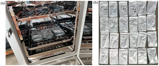 In order to better observe the experimental phenomenon and distinguish the aging stages more reasonably, aluminum bags were used to provide a semi-sealed environment to appropriately slow down the loss of moisture [19,31,32]. The PVA hydrogel materials wrapped in aluminum bags were subjected to high-temperature accelerated aging tests in a WGL-45L high-temperature test chamber. The equipment used in the test chamber is illustrated in Figure 2a. During the aging process, we changed the placement of the samples every 10 days to minimize the impact of their positioning on the results. To monitor the changes in sample performance with aging time, samples were taken after 20, 40, 60, and 80 d of aging, with six samples collected at each sampling time point, as shown in Figure 2b.