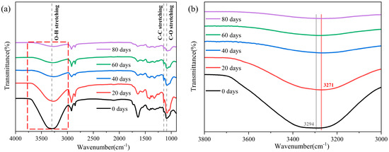 Changes in microscopic functional groups during aging process: (a) ATR-FTIR spectroscopic analysis; (b) spectrum of hydroxyl changes during aging process.