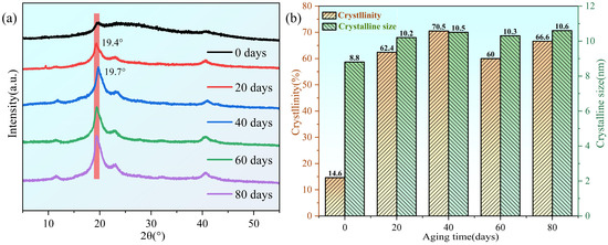 Changes in crystallinity analysis of samples during aging process: (a) X-ray diffraction curve; (b) changes in crystallinity and average size of crystalline regions during aging process.