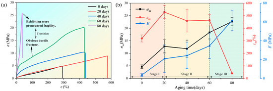 Changes in mechanical properties of samples during aging process: (a) stress–strain curve at different aging times; (b) changes in maximum tensile strength, maximum elongation, and initial modulus during aging process.