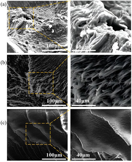 Figure 8 shows cross-sectional images of the samples aged at 60 °C for 0–80 days under a scanning electron microscope, elucidating the microstructural changes of the PVA hydrogel during the aging process. As shown in Figure 8a, the SEM images indicate that the fracture mode of the unaged sample was ductile, with a rough fracture surface and uneven fracture edges that appeared fibrous. As aging progressed, the fracture mode of the sample gradually transitioned to brittle fracture, with the fracture surface becoming smooth and flat, as shown in Figure 8b,c, respectively. This “ductile-brittle transition” fracture mode corresponds to the analysis of macroscopic mechanical properties.