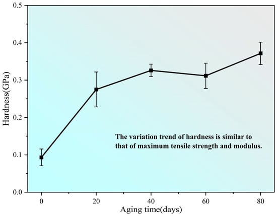 The hardness of the PVA hydrogel was determined in nanoindentation tests revealing a fluctuating increasing trend with continued aging, which is similar to the changing trend of the maximum tensile strength and initial modulus, as shown in Figure 9.