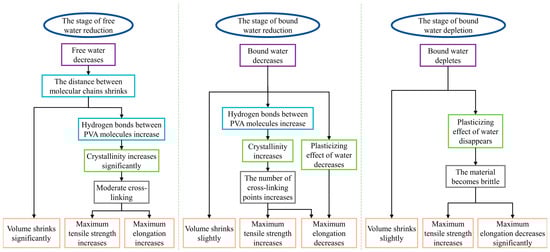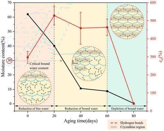 Based on the above results, we analyzed the aging mechanism of the PVA hydrogel. The unaged PVA hydrogel possessed a relatively high water content, with a portion of this water acting as a solvent that expanded the PVA molecular chains, categorized as free water. Additionally, it could function as bound water, forming hydrogen bonds with the -OH groups on the PVA main chains. According to Hodge et al. [26], the critical bound water content at which saturated hydrogen bonding occurred between PVA and water molecules was 30 wt%. Li et al. [30] indicated that bound water primarily acted as a plasticizer, providing sufficient free volume for the movement of PVA molecules, thereby ensuring the flowability of PVA molecular chains. Based on the aging characteristics presented by the PVA hydrogels, combined with the changes in their mechanical properties and water loss characteristics during the aging process, the aging of PVA hydrogels can be basically divided into three stages, namely, the reduction in free water, the reduction in bound water, and the depletion of bound water, as shown in Figure 10.