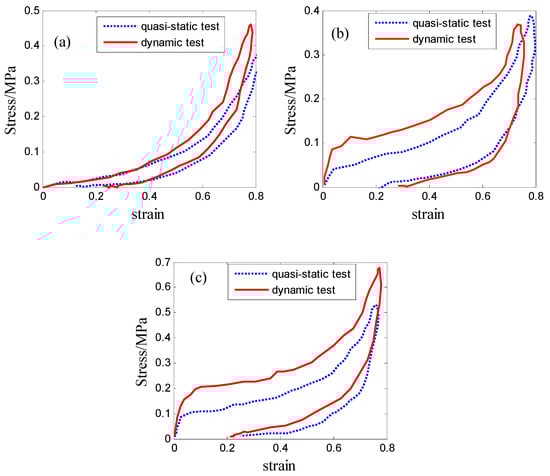 The foam dimensions of 10 cm × 10 cm × 5 cm were chosen for the 29 kg/m3 foam. The compressive velocity of 30 mm/min was applied for the compressor, corresponding to the compressive strain rate of 0.01 s−1. The same foam dimension was subjected to a free drop impact of the mass of 7.5 kg from a height of 60 cm. The engineering stress–strain curves could be transformed by twice integrating the acceleration–time signals. Figure 1a compares the quasi-static stress–strain curve with the dynamic stress–strain curve for the loading and unloading phases. It illustrates that the value of dynamic stress was higher than the quasi-static counterpart when the strain was bigger than 0.4. As can also be seen, the stress was almost the same when the strain was less than 0.4.