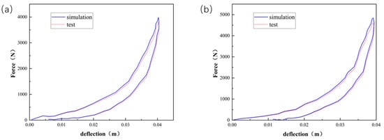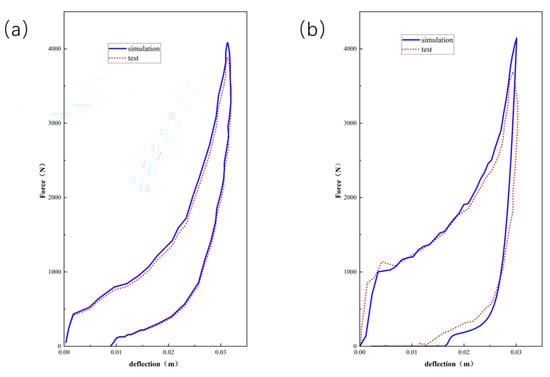 Employing Equations (7) and (9), Figure 3, Figure 4 and Figure 5 compare the simulated force–deflection curves with the experimental data for the EPE29, EPE36, and EPE58 PE foam samples under uniaxial loading and unloading conditions. This comparison served to verify the correctness of the parameter values listed in Table 1.