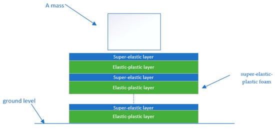 The treatment of the foam as a tandem of the mechanical properties of two typical foams is schematically shown in Figure 2. The two foam layers possessed identical cross-sectional areas but differing thicknesses, assuming the thicknesses of the respective portions were λL0 and (1−λ)L0, where L0 denotes the original total thickness. The ratio of the thickness of the super-elastic layer to the elastic-plastic layer was maintained as a constant λ/(1−λ). On this basis, the mechanical properties of foam in inhomogeneous compression were investigated, and the foam was regarded as a multilayer stack of two typical properties.