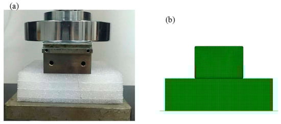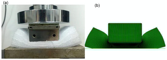 Figure 7 represents the initial state of EPE foam during the simulation and testing process.The simulated stress–strain result of EPE foam is presented in Figure 8, and the deformed shapes of 70% strain are shown in Figure 9. The above two figures show that the finite element simulations of the super-elastic-plastic foams model were consistent with the experimental results.